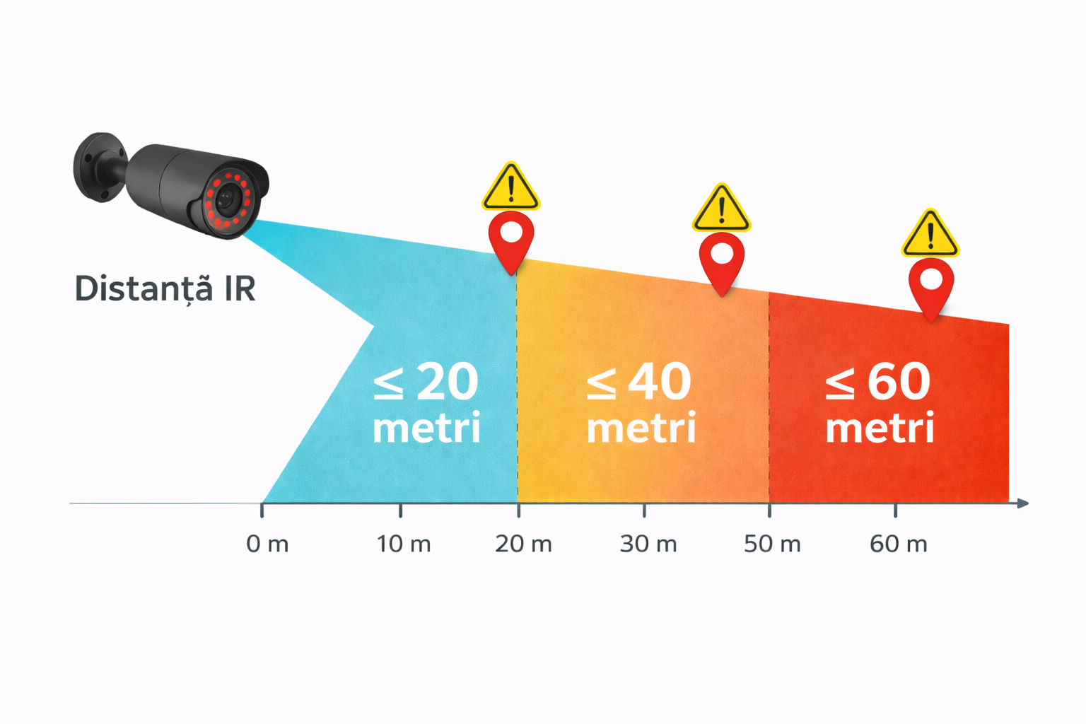 • pentru spații deschise (parcări, ferme) → IR 80m+.