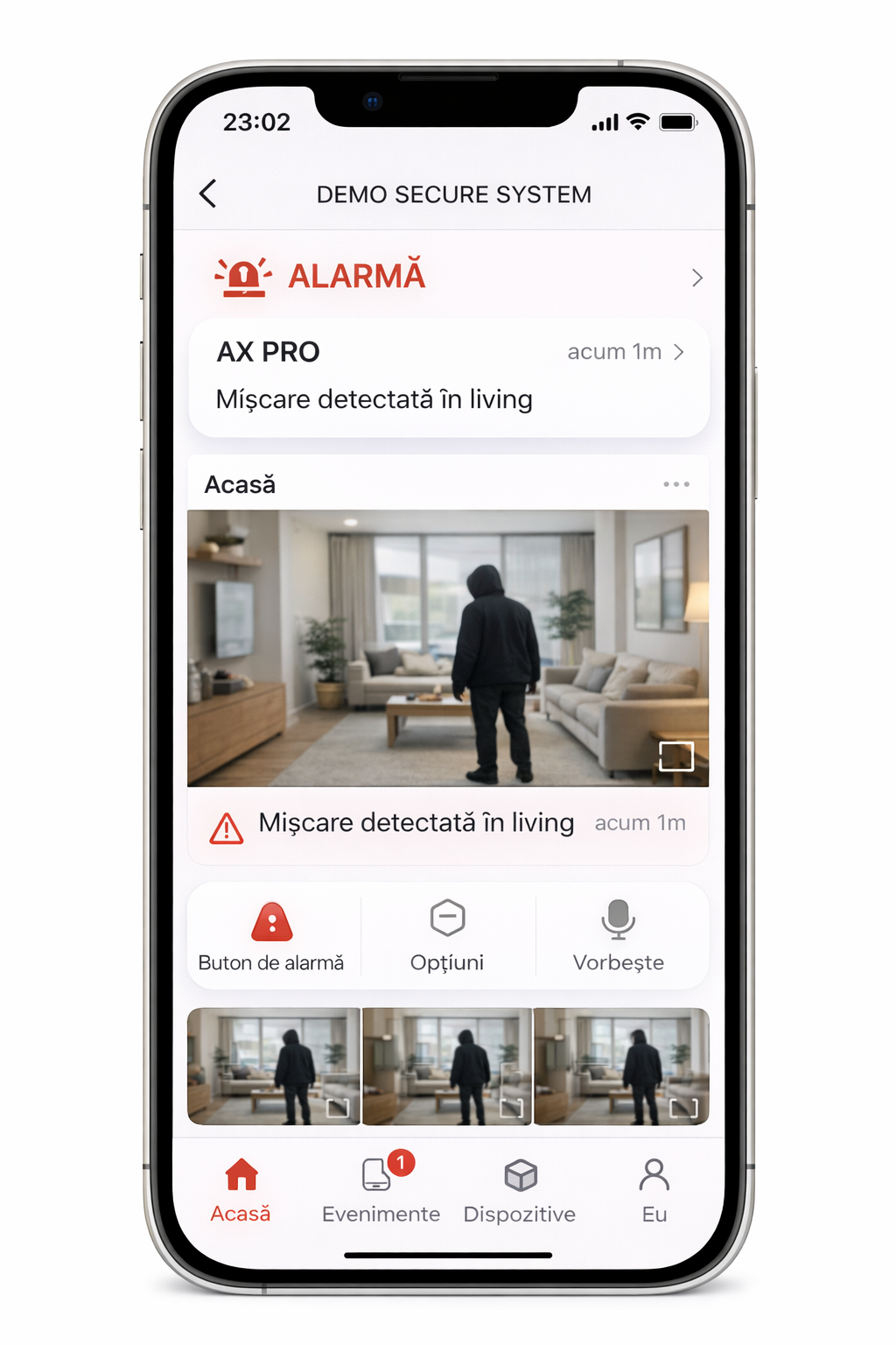 dacă o alarmă este declanșată, poți vedea imediat înregistrarea camerei respective;