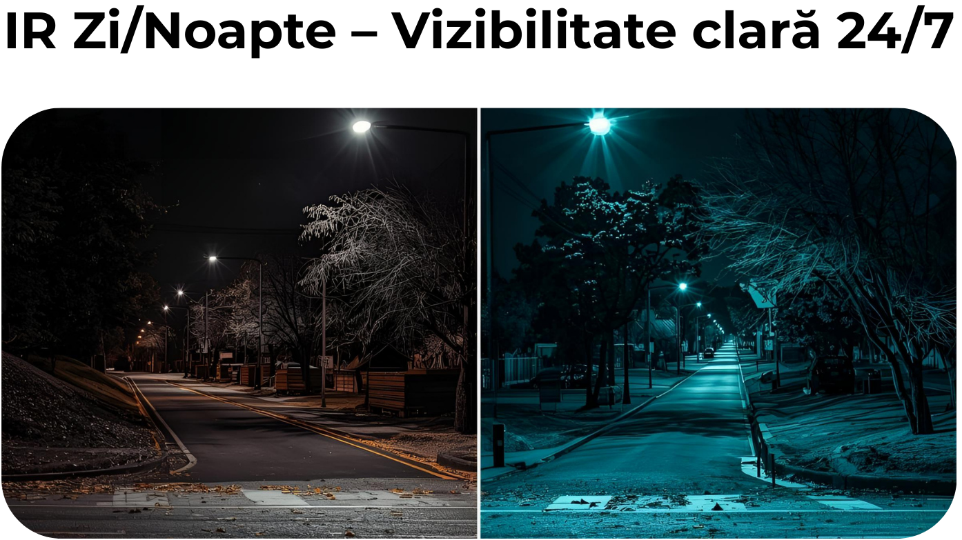 IR inteligentă cu distanță de până la 20m , oferind vizibilitate excelentă pe timp de noapte. Tehnologia Smart IR optimizează intensitatea LED-urilor pentru a preveni supraexpunerea obiectelor apropiate, menținând detalii vizibile și întuneric total.
