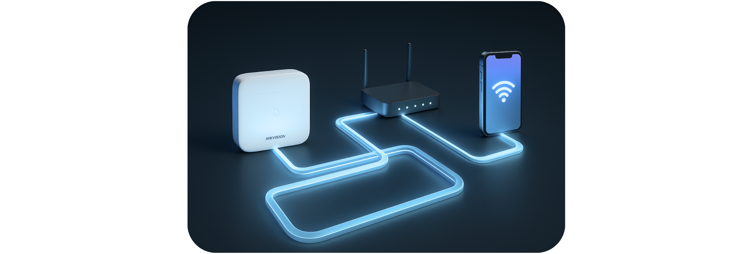 Centrala DS-PWA96-M-WE gestionează toate dispozitivele și comunicările sistemului. Suportă conectarea prin Wi-Fi, cablu LAN și SIM, oferind redundanță completă pentru transmiterea evenimentelor. Utilizează tehnologie wireless criptată pe 868 MHz, cu acoperire mare și transmisii stabile. Poate integra peste 100 de senzori și accesorii, iar prin aplicația Hik-Connect utilizatorul controlează armarea, dezarmarea, notificările, istoricul evenimentelor și configurarea zonelor.