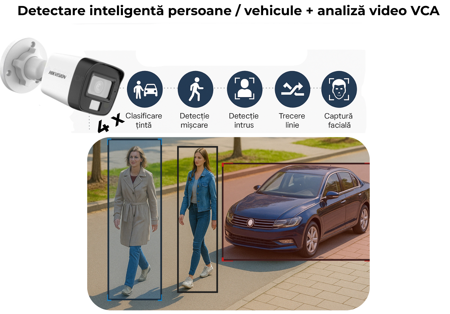 Functii AI: ColorVu, alarma stroboscopica, Detectie miscare, Detectie om/masina